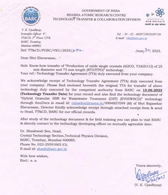 Agreement with BARC's Crystal Technology Lab - decades of research unlocked.